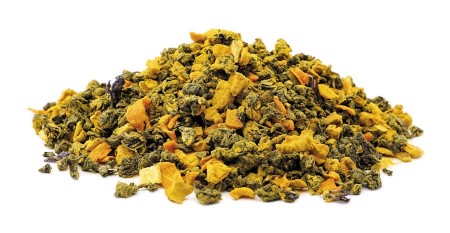 En økologisk teblanding du garantert aldri har sett maken til: I tillegg til 46% oolong-te finnes det her rikelig av kurkuma- (gurkemeie) og ingefærpulver samt gulrot, eple, lakrisrot, sikorirot, appelsinskall og kattostblomster. Kan det bli mer spesielt?